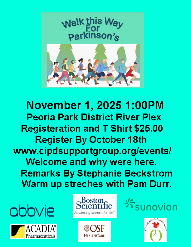 Events Here is What's Happening At Central Illinois Parkinson's Support Group 2025 Dates DateLocationEventOctober 4 2025Glen Park Place Pilgrimage to Enlightenment - The Journey to Becoming an Advocate. The MovieNovember 1 2025River Plex PeoriaWalk fo Parkinson'sDecember 6, 2025Avantis NorthChristmas Lunch Next EventNovember 1, 2025Walk this way for Parkinson’sSee BelowAn event to raise awareness and funds for the support group. The Central Illinois Parkinson’s Support Group will hold it’s first annual Walk This Way For Parkinson’s. November 1, 2025.A short walk along the Illinois River behind the river Plex.We want this to be a Family event so tell everyone to save the date.You can Register Here